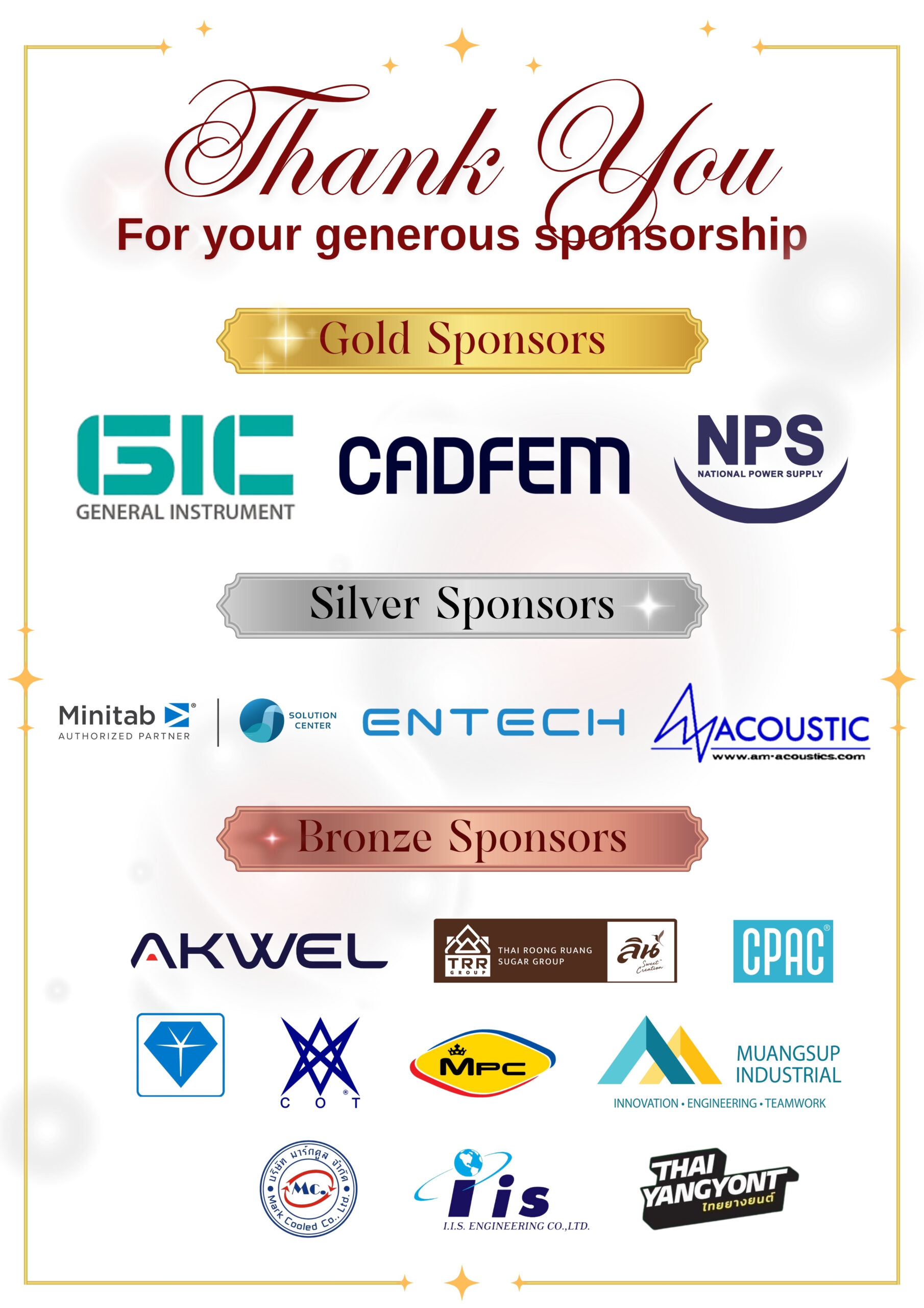 The organizing committee of TSME-ICoME 2025 would like to express our sincere appreciation to all our sponsors for their generous support. Your contributions play a vital role in ensuring the success and sustainability of this international academic platform, which brings together leading experts, researchers, and industry representatives in the field of mechanical engineering.